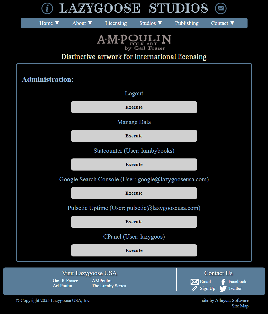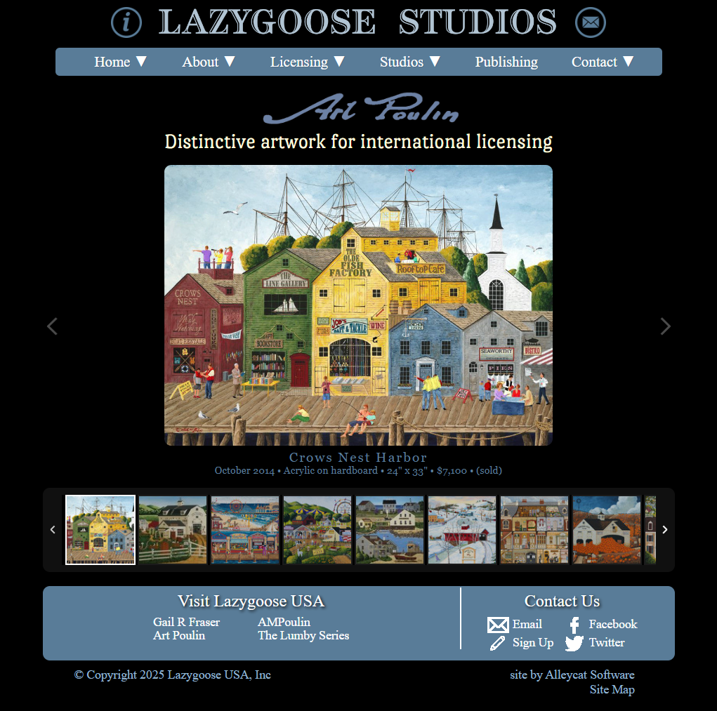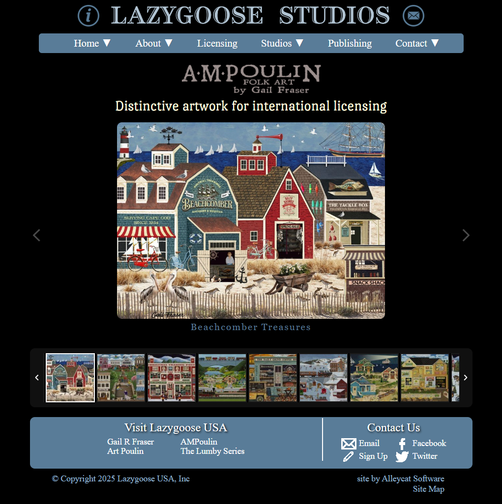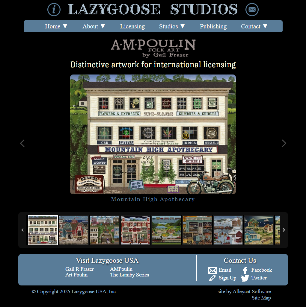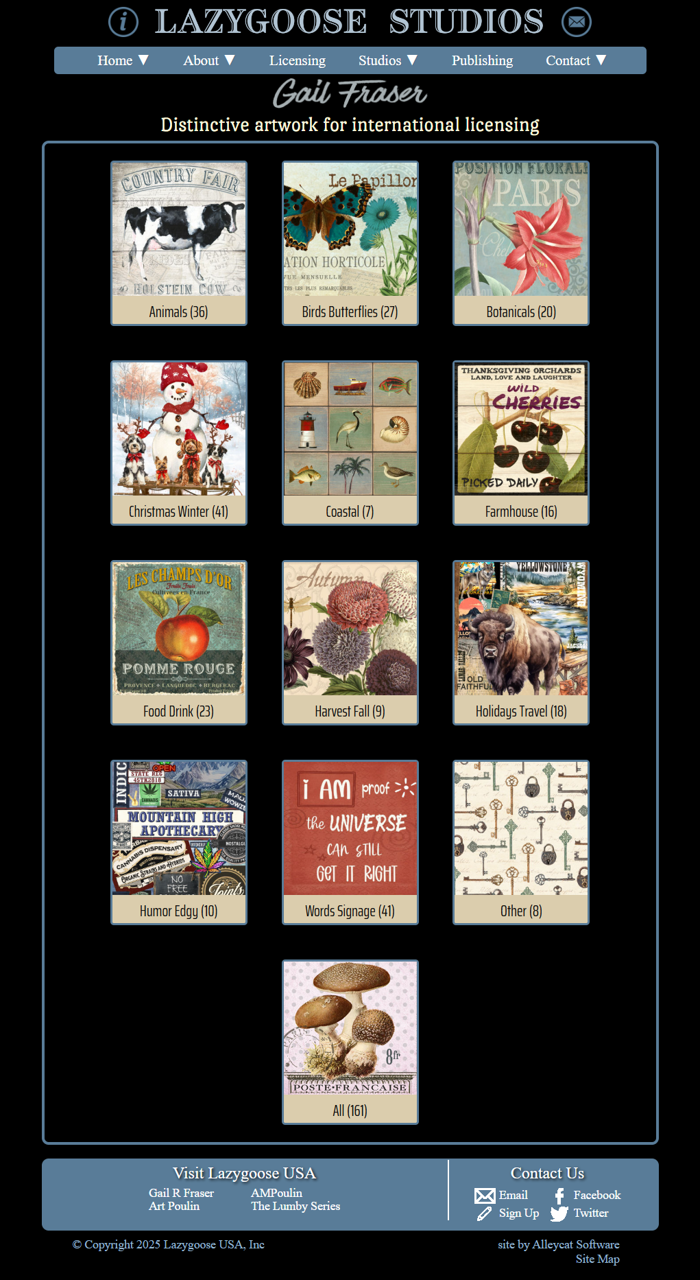 Lazygoose USA encompasses a suite of sites, many with a scrolling gallery, contact form, newsletter signup, pulldown menu, fully responsive interface, and administrative tools to add/change/delete: