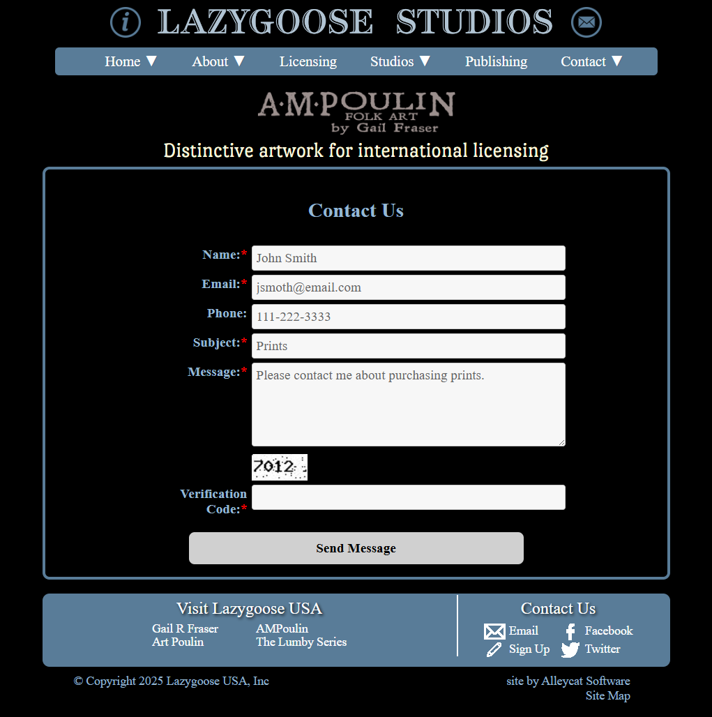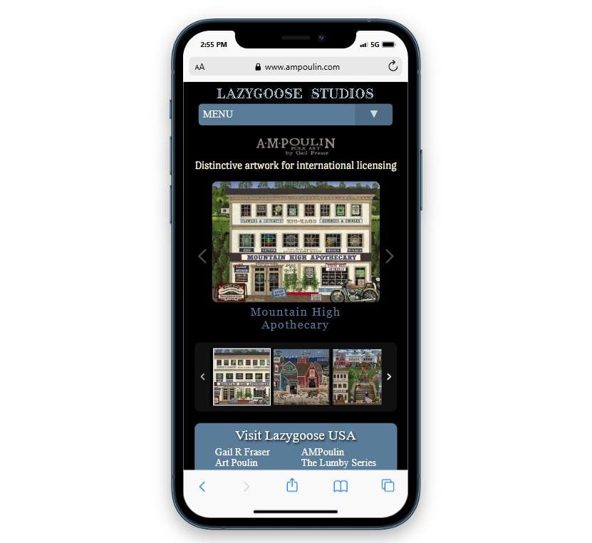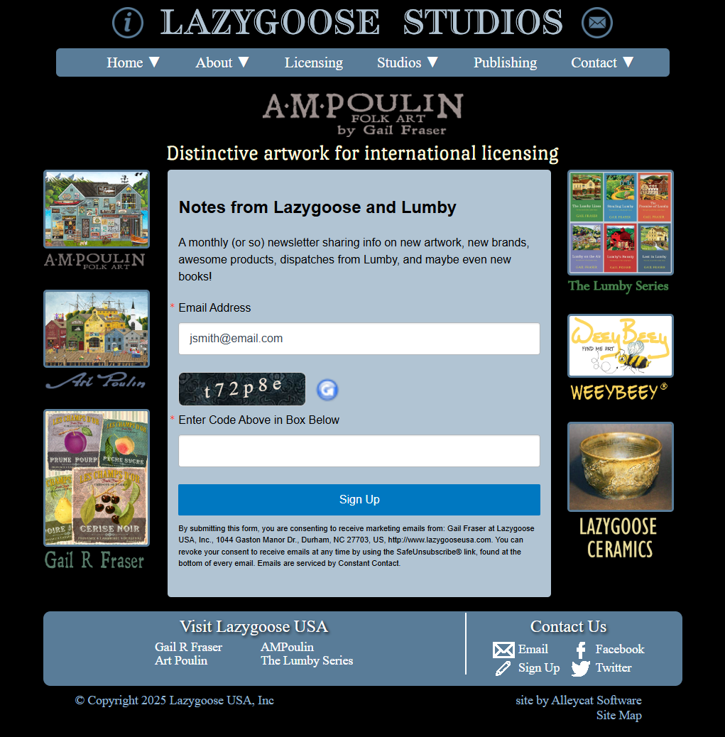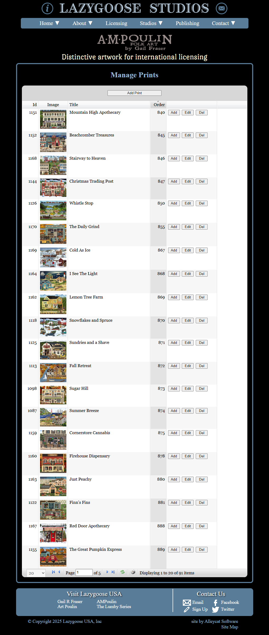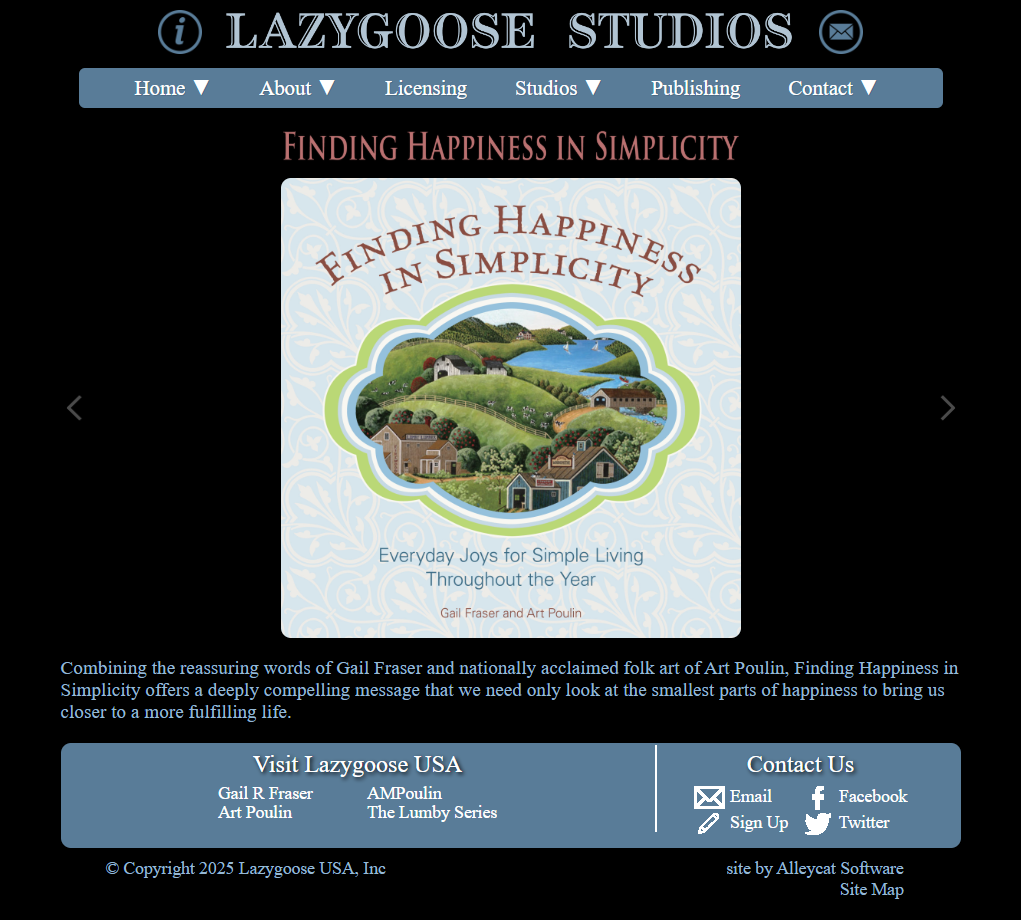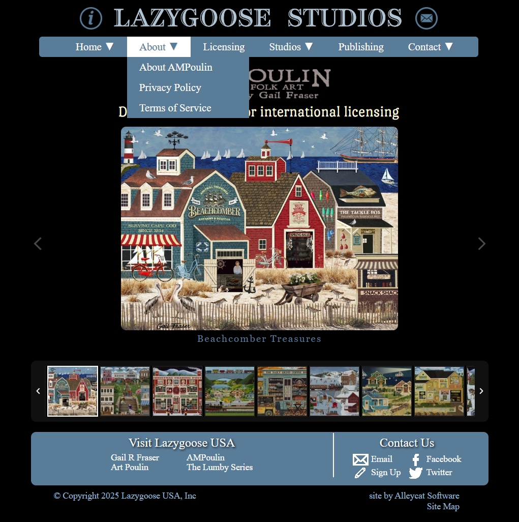 Lazygoose USA encompasses a suite of sites, many with a scrolling gallery, contact form, newsletter signup, pulldown menu, fully responsive interface, and administrative tools to add/change/delete: